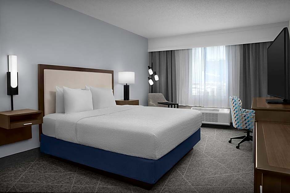 This guestroom includes a 32-inch flat-screen TV, a microwave, and a small refrigerator.